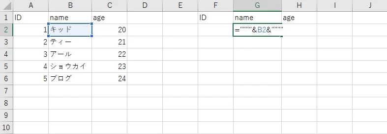 この場合ですと「=””””&B2&””””」と入力します。これで入力すると下記のような表示になります。